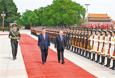 5月16日上午,國家主席習近平在北京人民大會堂同來華進行國事訪問的俄羅斯總統(tǒng)普京舉行會談。這是會談前,習近平在人民大會堂東門外廣場為普京舉行隆重歡迎儀式。