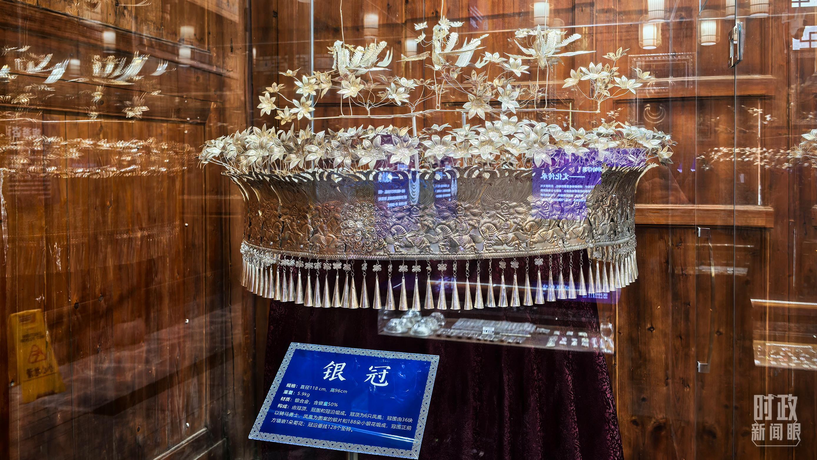 △銀飾是侗族婦女的重要裝飾。圖為展示中心內(nèi)的銀冠。(總臺央視記者鄂介甫拍攝)