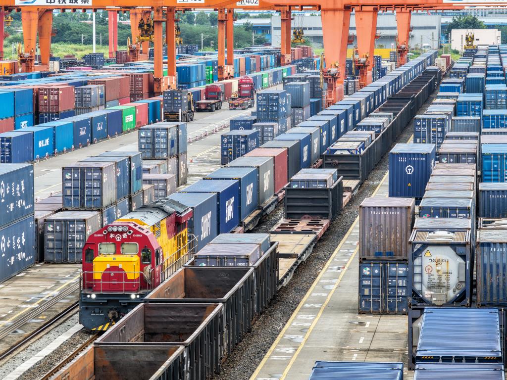 2025年9月8日,滿載“重慶造”汽車的中歐班列(成渝)在重慶團結村中心站等待發(fā)車(無人機照片)。 新華社記者 唐奕 攝