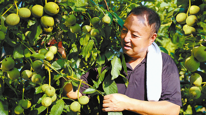 8月3日,在洛南縣景村鎮,華陽一升紅仁核桃專業合作社的技術人員正在檢查核桃生長情況。 (本報通訊員 吳書懷 攝)