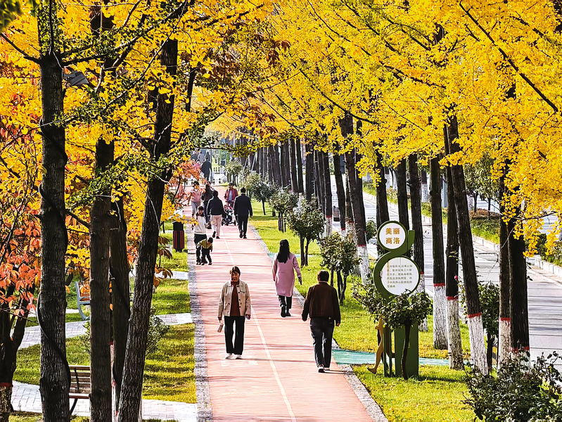 △在市區丹江公園,碧藍而高遠的天空、白色的橋和金色的銀杏葉倒映在清澈的河水中,如同一幅秋日油畫。 ?市區濱江銀杏公園內,市民在高大的銀杏樹間散步,盡顯秋日的愜意。