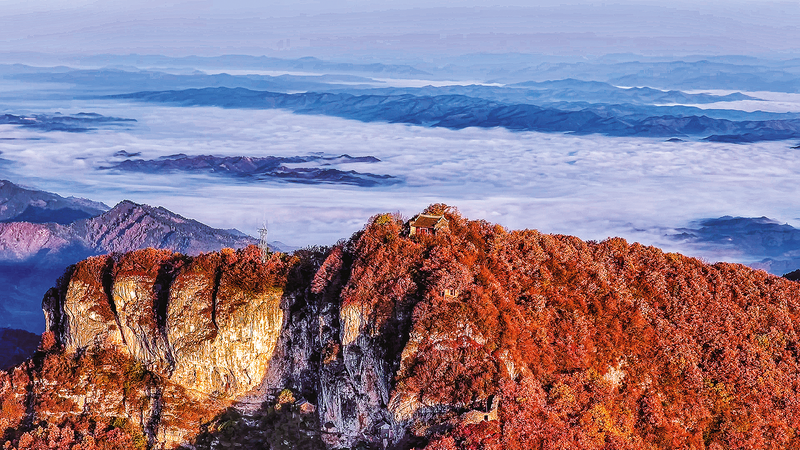 △位于洛南縣高耀鎮(zhèn)的文顯山林木茂密。深秋時(shí)節(jié),滿山紅葉色彩濃烈,襯托得山間流動(dòng)的云海更為壯觀。