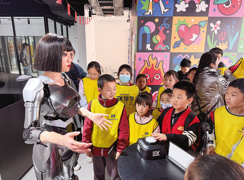 隨后,愛因斯坦仿生機(jī)器人吸引了大家的目光。通過先進(jìn)的面部動態(tài)捕捉系統(tǒng),機(jī)器人能夠?qū)崟r捕捉每個人的面部表情并進(jìn)行精準(zhǔn)模仿。“這也太厲害了吧!它做出的表情和我們的一模一樣!”幾名小記者激動地說。緊接著,在講解員的帶領(lǐng)下,小記者穿過激光通道,李白、杜甫等歷史名人以機(jī)器人形態(tài)呈現(xiàn)在大家面前。“好雨知時節(jié),當(dāng)春乃發(fā)生。隨風(fēng)潛入夜,潤物細(xì)無聲……”看著臺上的杜甫機(jī)器人,小記者情不自禁地吟誦起經(jīng)典詩句。