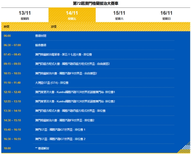 首日(13日),主要以各大賽事的自由練習(xí)賽為主,澳門格蘭披治電單車(摩托車)、國(guó)際汽聯(lián)四級(jí)方程式世界杯、國(guó)際汽聯(lián)FR世界杯(區(qū)域方程式)、TCR世界巡回賽以及GT世界杯等核心賽事均完成了首次練習(xí)。