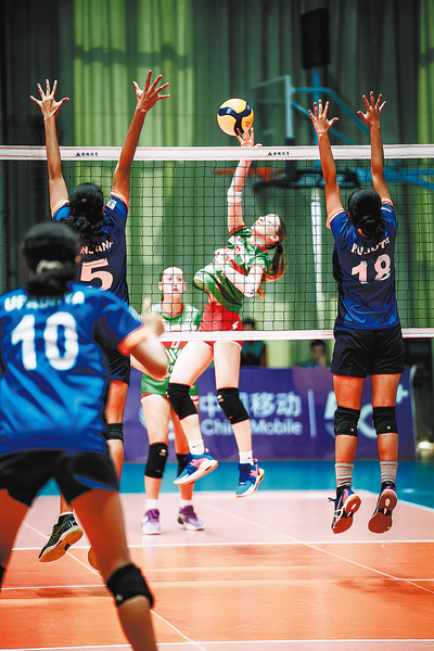 ⑥12月11日,在保加利亞隊(duì)和印度隊(duì)的比賽中,保加利亞女隊(duì)員的扣球瞬間。