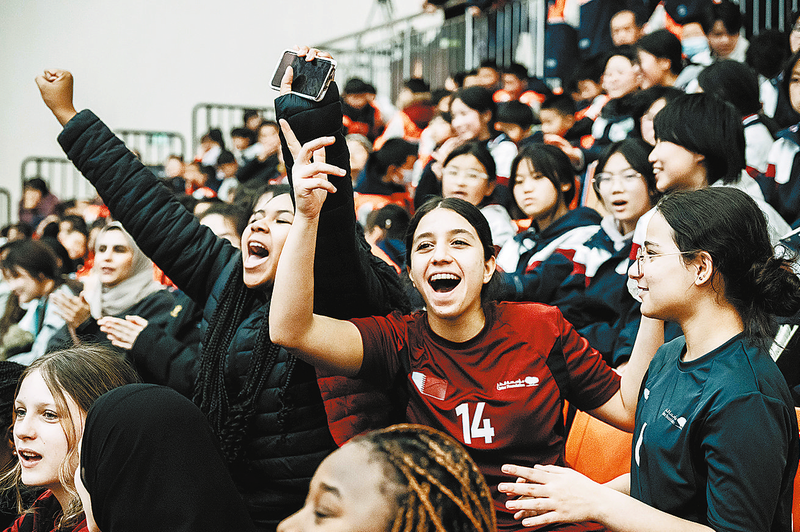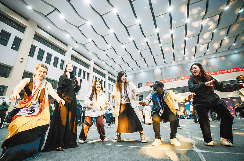 ⑦12月9日,“國家之夜”活動(dòng)中,各國運(yùn)動(dòng)員與現(xiàn)場(chǎng)的工作人員、學(xué)生等一起跳舞互動(dòng)。