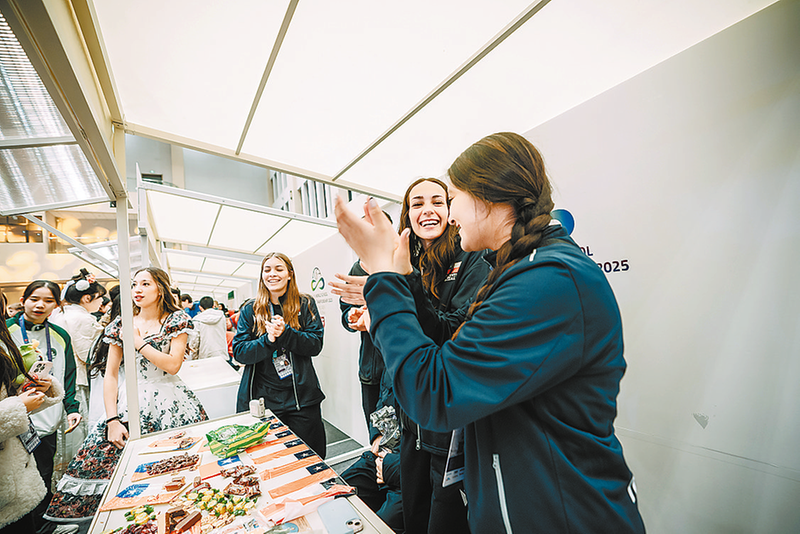 ②12月9日,在“國家之夜”現(xiàn)場(chǎng)的文化展示區(qū)域,有的參賽隊(duì)伍帶來了巧克力、咖啡等特色產(chǎn)品,吸引了眾多參賽隊(duì)員駐足品嘗。