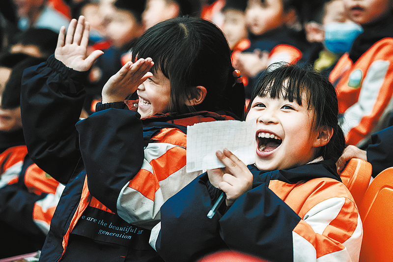 ?精彩的比賽引得看臺(tái)上的小學(xué)生熱烈鼓掌歡呼。