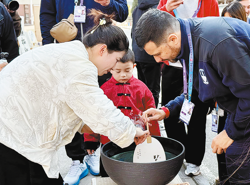 ③12月9日,文化交流日當(dāng)天,各國運(yùn)動(dòng)員走進(jìn)我市六所學(xué)校感受中國文化和體育發(fā)展的蓬勃活力。圖為球員在商州區(qū)六小感受中國書法和書畫的魅力。
