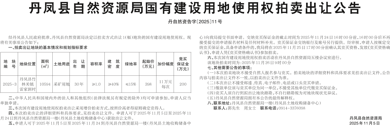 丹鳳縣自然資源局國有建設用地使用權拍賣出讓公告