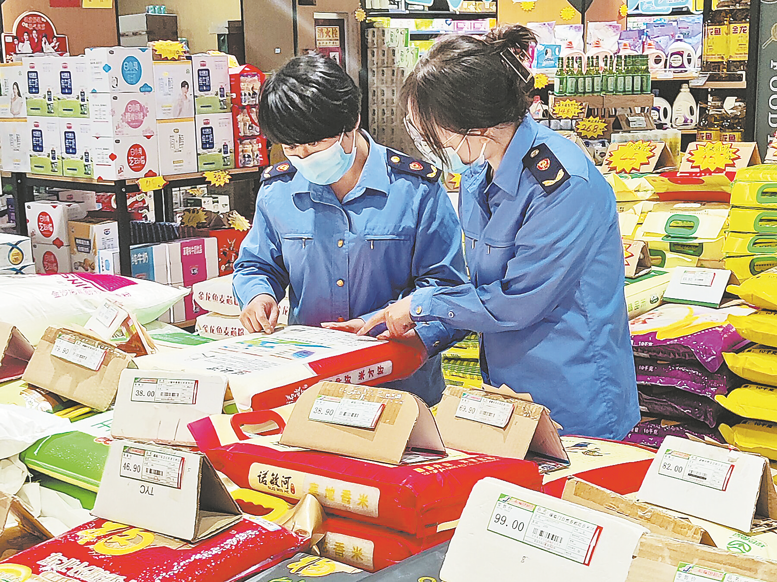 今年以來,商南縣加強行政指導和監督檢查,強化商標品牌保護,維護規范市場秩序。圖為近日縣市場監督管理局執法人員正在超市檢查袋裝大米商標情況。