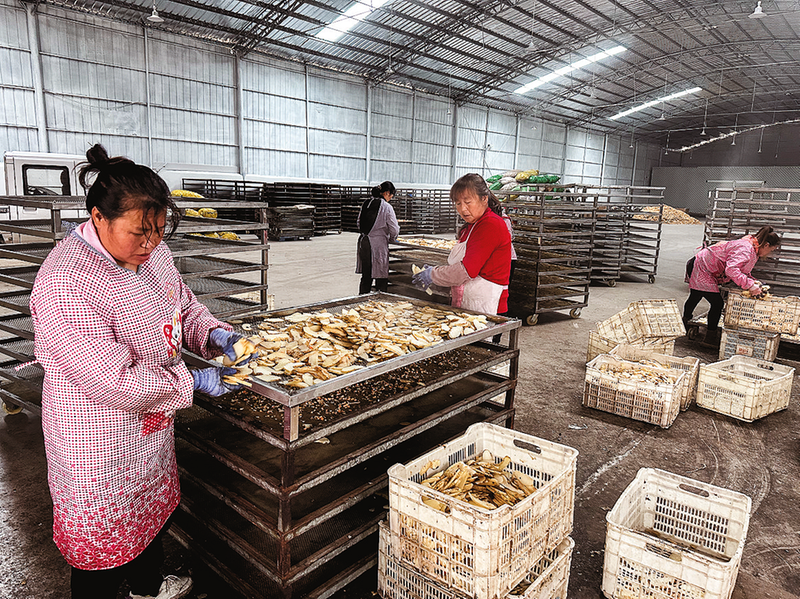傳明中藥材種植農(nóng)民專業(yè)合作社的天麻切片加工廠內(nèi),工人正在晾曬天麻。