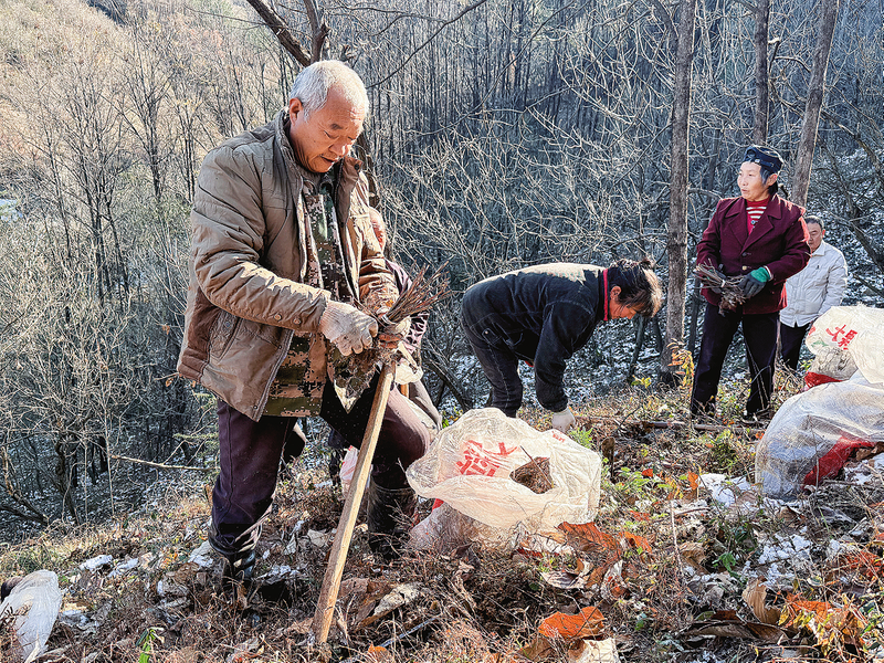 11月19日,商南縣富水鎮(zhèn)黃土凸村的山壟間,初雪未融,山風(fēng)裹著幾分凜冽,卻擋不住林地陰坡上的熱鬧。一群村民手持鋤頭、提著鼓囊囊的小通草樹(shù)苗袋,彎腰、刨坑、放苗、培土,動(dòng)作嫻熟利落。新栽的幼苗在殘雪映襯下,透著勃勃生機(jī)。這是黃土凸村種下小通草的第二年,也是這個(gè)藏在深山里的村落掙脫“增收難”枷鎖、改寫(xiě)發(fā)展軌跡的關(guān)鍵契機(jī)。