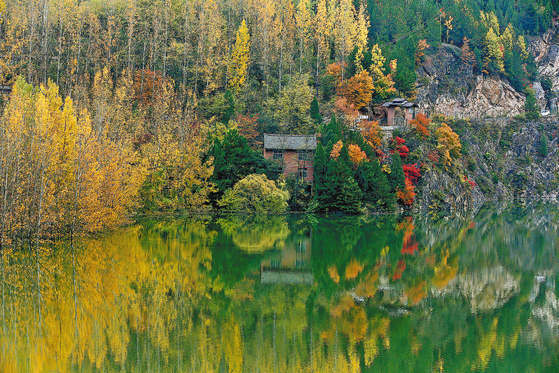 用無人機(jī)沿湖俯瞰,湖畔各種顏色的葉片組成黃的、紅的、橙的、綠的色塊,或是自成一景獨(dú)立于山崖之上,或是相互交融沿山坡一瀉而下;湖面不時(shí)有黑色鸕鶿或白色鷺鳥掠過,為這里的美景帶來了詩(shī)意與靈氣。