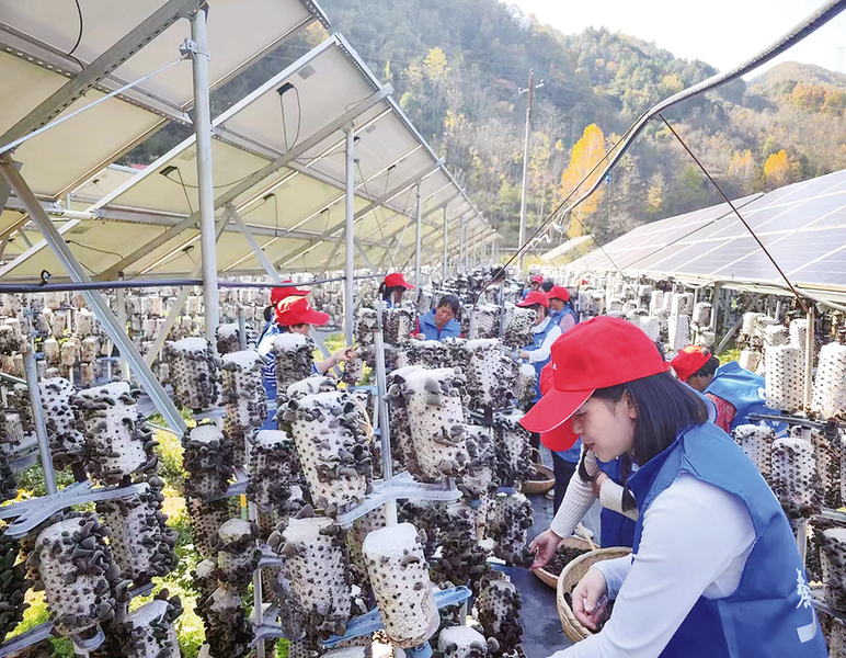 廟溝村的現代農業產業還不止香菇。在產業園北側,一片“農光互補”基地格外吸睛——成排的光伏板下,塔式木耳種植架整齊排列。“棚頂發電、棚下種植”的模式,年增收21.5萬元,木耳種植畝均效益提升40%。光伏發電每年為村集體經濟貢獻18萬元收入,板下種植的黑木耳還能再盈利,實現了一塊地兩份收入。